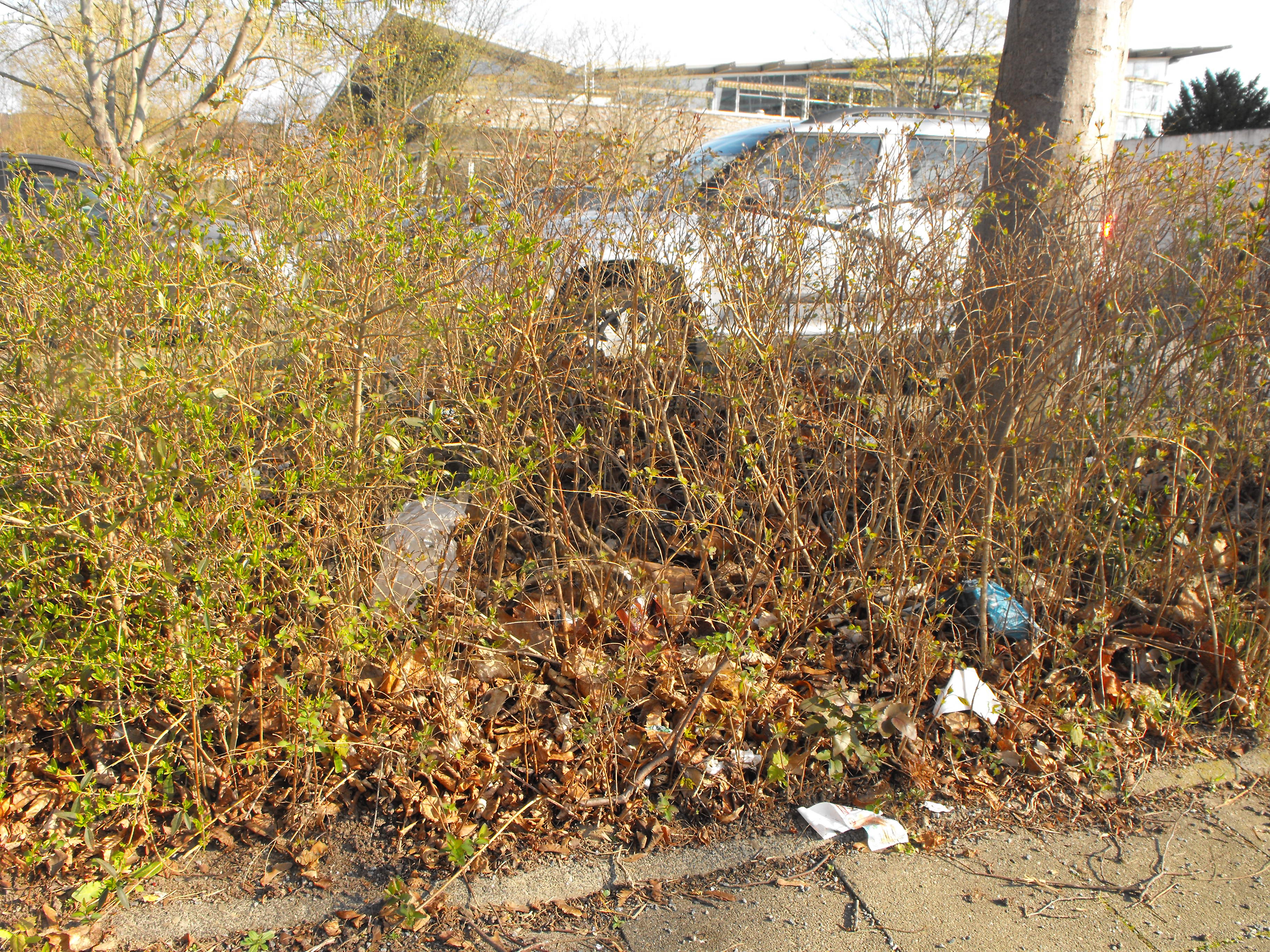 An einer Ecke scheint ein Raucher seit Monaten ständig seine leeren Zigarettenschachteln zu hinterlassen, denn es ist stets die gleiche Marke. Natürlich sind auch Zigarettenkippen dort zu finden. Keine drei Meter davon lag eine kaputte Flasche mit den gefährlichen Bruchstellen nach oben im Beet. Auch sonst dauert es – zumindest im Stadtteil Heidberg – mindestens viele Wochen – bis Glasscherben, Plastikmüll oder anderer Müll entsorgt wird.